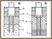 Виды свай. А) - висячие сваи; Б) - сваи-стойки; 1 - плотный грунт; 2 – пластичный грунт; 3 – илистый грунт; 4 - песок; 5 - торфяник; 6 – слой растительности; 7 - ростверк.