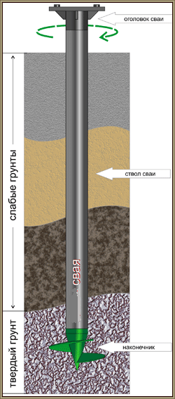 В последнее время, в частном строительстве, все больше находят применение стальные винтовые сваи. Это металлические сваи, которые имеют «резьбу» на конце в виде лопасти приваренной к стволу сваи под расчетным углом (наружный диаметр лопасти 3-3.5 диаметра сваи). С помощью специальной техники или вручную они погружаются в грунт завинчиванием, подобно шурупу в дерево. При завинчивании сваи она не разрыхляет, а уплотняет грунт. Винтовые сваи применяют для легких зданий: деревянных, щитовых, из газобетона, а также для опор мостов, заборов и ворот и т. д. Такие сваи, при строительстве коттеджного участка могут применяться для возведения зданий инфраструктуры – хозпостроек, гаражей, бань, туалетов, заборов и т. д.