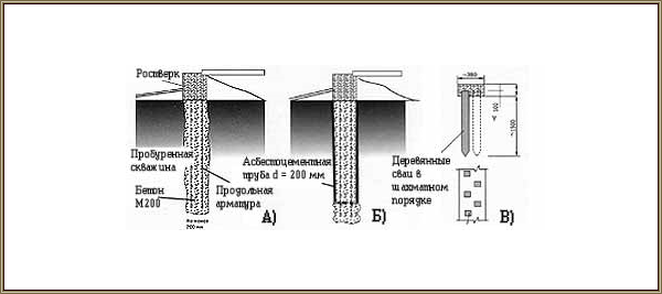 А) – сваи буронабивные; Б) - сваи из асбестоцементных труб; В) – деревянные сваи.