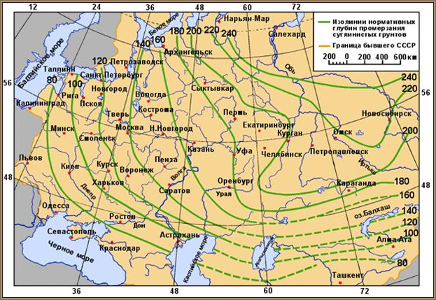 Величины промерзания грунта в различных климатических зонах приведена на карте в приложении 1.