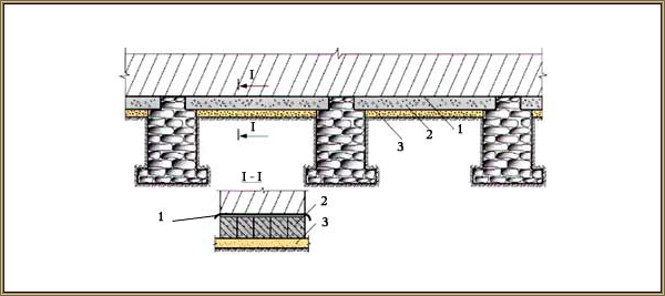 Схема столбчатого фундамента.1 - горизонтальная гидроизоляции; 2 - ростверки; 3 – песчаная подушка.