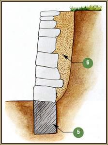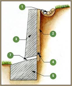 1. Водоотвод верховых вод. 2. Засыпка дренажного гравия. 3. Основа стенки - фундамент. 4. Тело стенки. 5. Дренаж грунтовых вод.