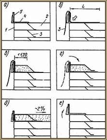 Последовательность возведения подпорной стенки из грунта (армированного геотекстилем): а - монтаж опалубки, б - крепление геотекстиля в опалубке с выпуском свободного края наружу, в – засыпка и уплотнение первой части грунта, г – перекрытие грунта выпущенным краем геотекстиля, д – засыпка и уплотнение второй части грунта, е - перемонтаж опалубки для следующего уровня стенки. 1 – наружный контур облицовки, 2 – наполнительный грунт, 3 - армирующие полотно из геотекстиля, 4 - металлический уголок. 5 – подпорная стойка.