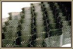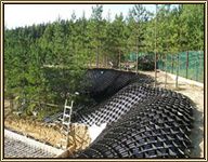Секции георешоток, производятся из прочных, и в тоже время, гибких полиэтиленовых лент, что позволяет возводить подпорные стенки различной конфигурации и на любом рельефе.