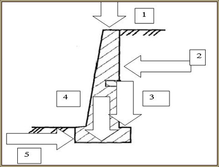 Как видно из схемы силы носят вертикальное и горизонтальное направление. Силы от нагрузок 4, 1, 3, 5 являются друзьями стенки, они обеспечивают ее устойчивость на грунте и помогают удерживать грунт от сползания. А вот сила 2 пытаются ее сдвинуть, создать скольжение по подошве фундамента или даже опрокинуть.