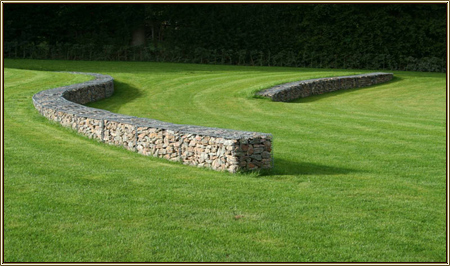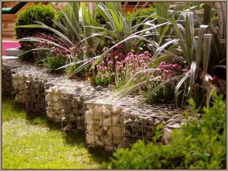 Из коробчатых габионов формируют гибкие, проницаемые структуры в виде подпорных стенок. Со временем, когда в пустоты между камнями попадет, а лучше специально насыпан грунт, на этом субстрате засеиваются неприхотливые дикорастущие растения с хорошо развитой корневой системой. В результате этого, габионы гармонично вписываются в искусственно создаваемую окружающую среду и становятся частью ландшафтной композиции участка. Кроме того, аккумуляция частиц грунта играет роль связующего материала для заполнителя, что способствует увеличению прочностных свойств подпорной стенки с каждым годом.