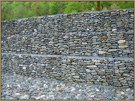 Габионы устроены достаточно просто. В прочные проволочные контейнеры укладывают дробленые или обычные камни (от 0,5 кг и более). Если заполнителем является гравий, галька, щебень применяется сетка с более мелкой ячейкой, чем для камня. Сетка для габионов изготавливается из закаленной оцинкованной стальной проволоки двойного кручения плотного оцинкования или с покрытием (по ГОСТ Р 52132-2003). Если конструкции из габионов сооружают в зоне с воздействием агрессивных сред, то на проволоку наносят, дополнительно, покрытие ПВХ, которое защищает проволоку и обеспечивает устойчивость от повреждений.