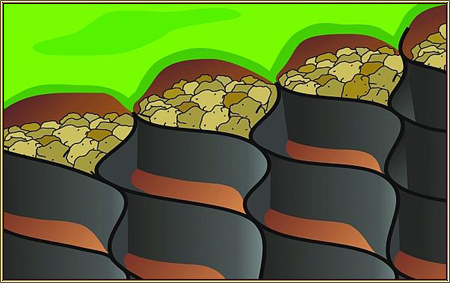 - наполнение объёмных ячеек грунтовым материалом (грунт, щебень). Посев растительности в ячейки.