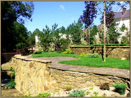 На наших, в основном равнинных просторах, подпорные декоративные стенки помогают создать иллюзии горных рельефов и подчеркивают имеющийся естественный перепад высот на территории коттеджа.