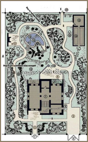 Пример зонирования участка. А - въездная зона, где: 1 - входная калитка; 2 - розарий и цветник; 3 - парадный вход в коттедж; 4 – въезд; 5 - парковка на 3 машины; 6 - вход в котельную. Б -.коттеджная зона, где: 7 - коттедж; 8 - вход в кухню, столовую; 9 - зимняя терраса; 10 - малые формы (скульптура); 11 - фонтан; 12 - игровая поляна. В – хоз зона где: 13 - летний блок питания; 14 - отапливаемая теплица; 15 - питьевой колодец; 16 - малина; 17 - калитка в лес. Г - зеленый декоративный участок, где: 18 – водное зеркало; 19 - китайский мостик; 20 - японский сад; 21 - можжевельник; 22 - детская площадка; 23 - малина; 24 – фруктовые деревья; 25 – ягодные кусты. Д - соседи. Е - березовая роща.