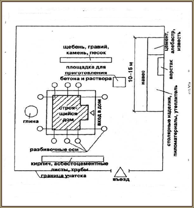 Выровненная и подготовленная к строительству площадка должна быть на 1,5 -2 м по всему периметру больше габаритов дома. При наличии на участке уклона, отрывают водоотводную траншею (со стороны склона), чтобы отвести дождевую воду и недопустить затопления котлована фундамента. Для правильной организации работ, на стройплощадке обустраивают места размещения материалов (см. примерную схему).