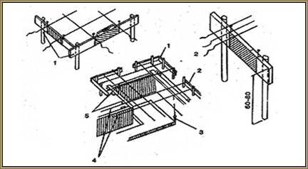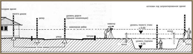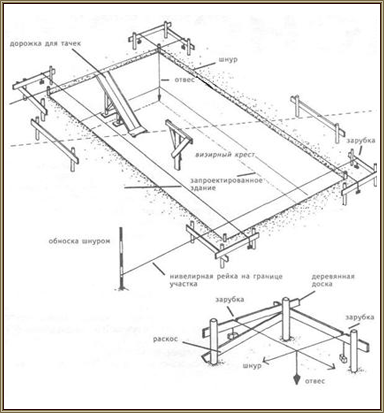 По внешнему очертанию будущего здания (2 - 3 м от сторон), натягивают шнур, образуя линии. В их створе устанавливают (расстояние 3 – 3,5м) стойки (металлические или инвентарные) строго вертикально. С внешней стороны к стойкам крепятся доски, верх которых выверяется строительным уровнем в горизонтальной плоскости.