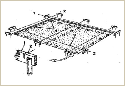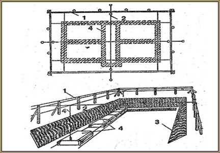 Схема разметка фундамента шнурами, где: 1- деревянная обноска; 2-шнур (проволока); 3-наружная стена котлована; 4-плиты фундамента.