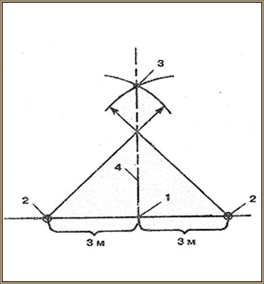 Построение пересечения двух кривых для получения прямого угла, где: 1-исходная точка; 2-колышки; 3-пересечение дуг; 4-искомый перпендикуляр.