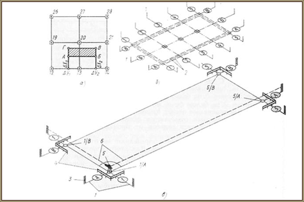 а-геодезическая сетка (схема разбивки) , б-разбивка на местности (осей здания), в- оси на обноске (перенесение), где: 1-оси; 2-контуры коттеджа; 3-контрольные знаки; 4-обноска (деревянная или инвентарная) ; 5- строительный теодолит; 6-луч теодолита (визирный). 1/А, 1/В, 5/А, 5/В пересечение осей (основных).