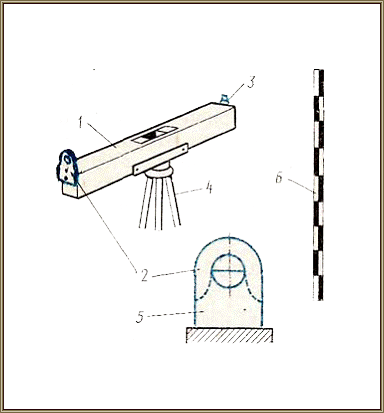 Самодельный нивелировочный инструмент включает: 1-обычный строительный уровень; 2-самодельный окуляр; 3-мушка; 4-фото тренога; 5-наблюдаемый вид; 6-самодельная рейка геодезическая.