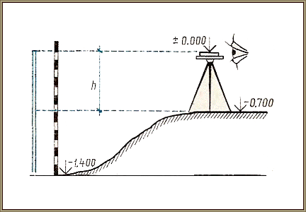 При наличии на участке уклона, одновременно определяют перепады высот. Это выполняется в каждой измеряемой точке относительно нулевой отметки отсчета. Для этого используют самодельный нивелир и вешки с двухцветной разметкой. Перепад высот «Х» определяется как разница «Н» (высота измеряемой вешки) и «Но» (высота установки нивелира от уровня земли). «Х» = «Н» - «Но».