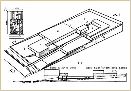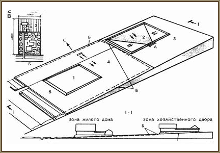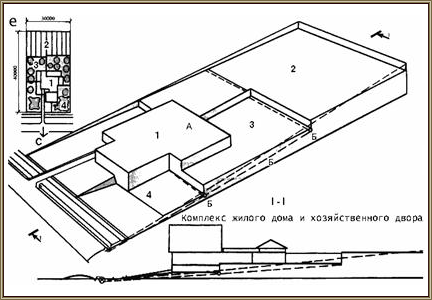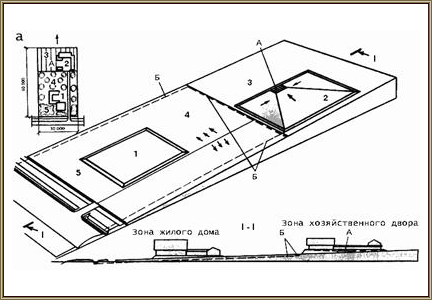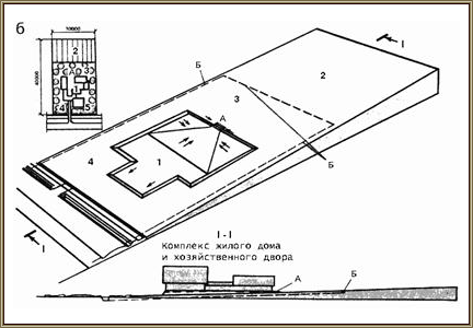 Участок расположен на северном склоне. При этом планируется раздельное расположение коттеджа и хозпостроек. А – отвод ливневых вод хоздвора. Б – ливневые стоки. 1-зона коттеджа, 2-хозпостроики, 3- плодовые кустарники и овощные культуры, 4 и 5- фруктовые и декоративные деревья.