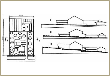 Однако, практически идеально ровных участков не существует, всегда будет присутствовать уклон местности какой либо величины. При этом, если здание возводится на склонах, требуется решать ряд вопросов с планировкой рельефа. Часто применяют комбинированное размещение зданий с организацией ровных площадок - террас (см. схему). Этот инженерный прием сводит к минимуму объема земляных работ и максимально снижает денежные расходы на строительство.