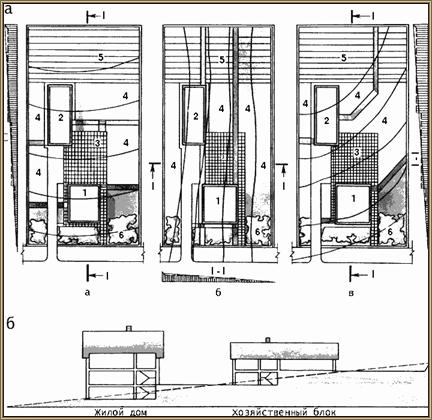 Схема террас (А) и применение откосов в коттедже и хозпостройках (Б): а - склон по длинной стороне; б - то же по короткой стороне; в - то же по диагонали участка;