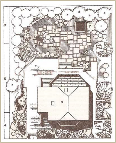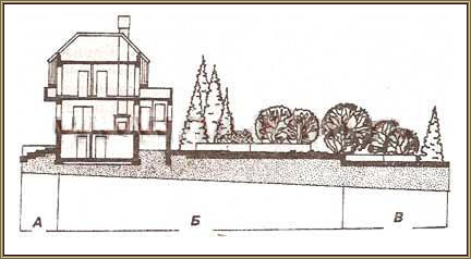 А – подъем к входу на участок; Б - высокая терраса; В – низкая терраса